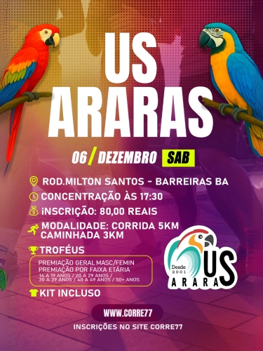 Desafie seus limites e venha fazer parte da história da Us Araras Run — uma corrida que vai contagiar Barreiras com energia, movimento e alegria!